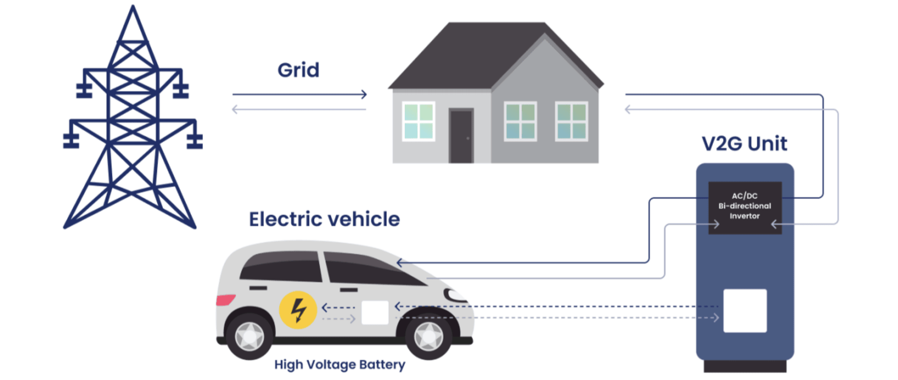 Vehicle-to-Grid (V2G) е технологија која овозможува комуникација и размена на енергија помеѓу електричните возила и електричната мрежа. Кога возилото е приклучено на двонасочен полнач, енергијата складирана во неговата батерија може да се врати назад во мрежата, особено кога побарувачката за струја е зголемена. Ова го претвора секое електрично возило во активен учесник во енергетскиот систем.